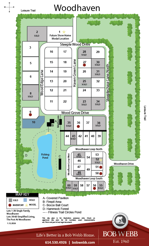 A beautiful Simplified Living community for homeowners age 55+ ready to enjoy a low maintenance, lock-and-leave lifestyle. Each plan focuses on easy-living style and convenience with first-floor owner’s suites, private outdoor living spaces, spacious kitchens with Bob Webb’s signature Messy Kitchen, as well as exceptional design options and selections for luxury living just the way you like it.