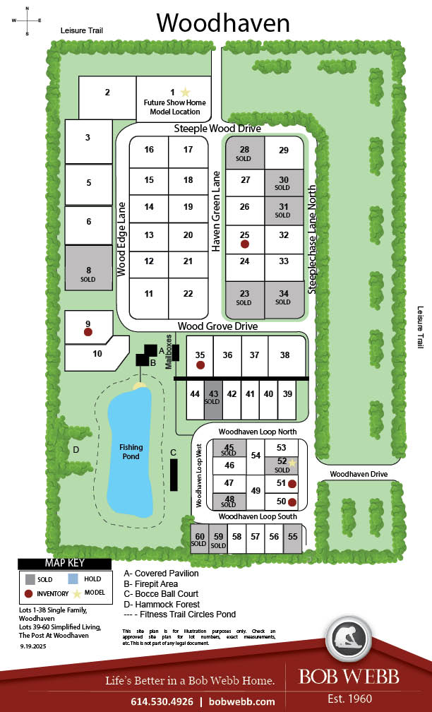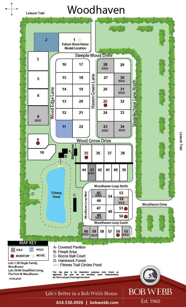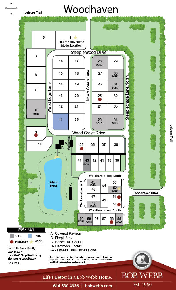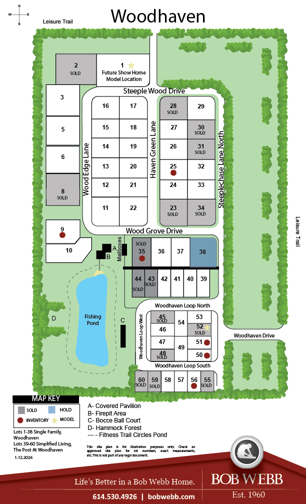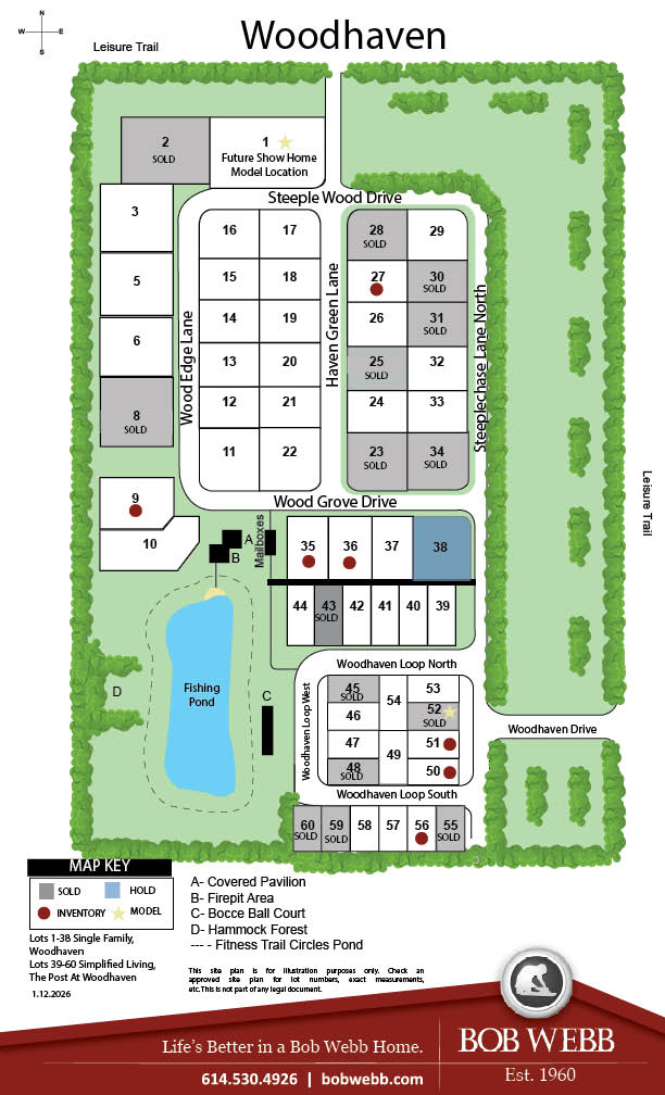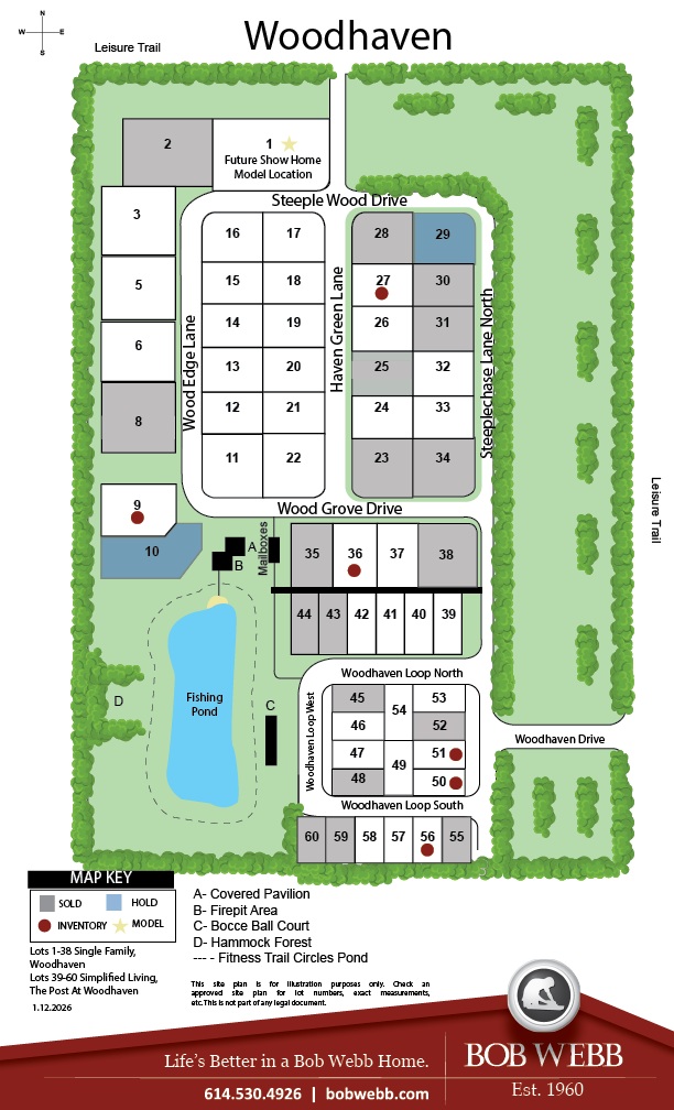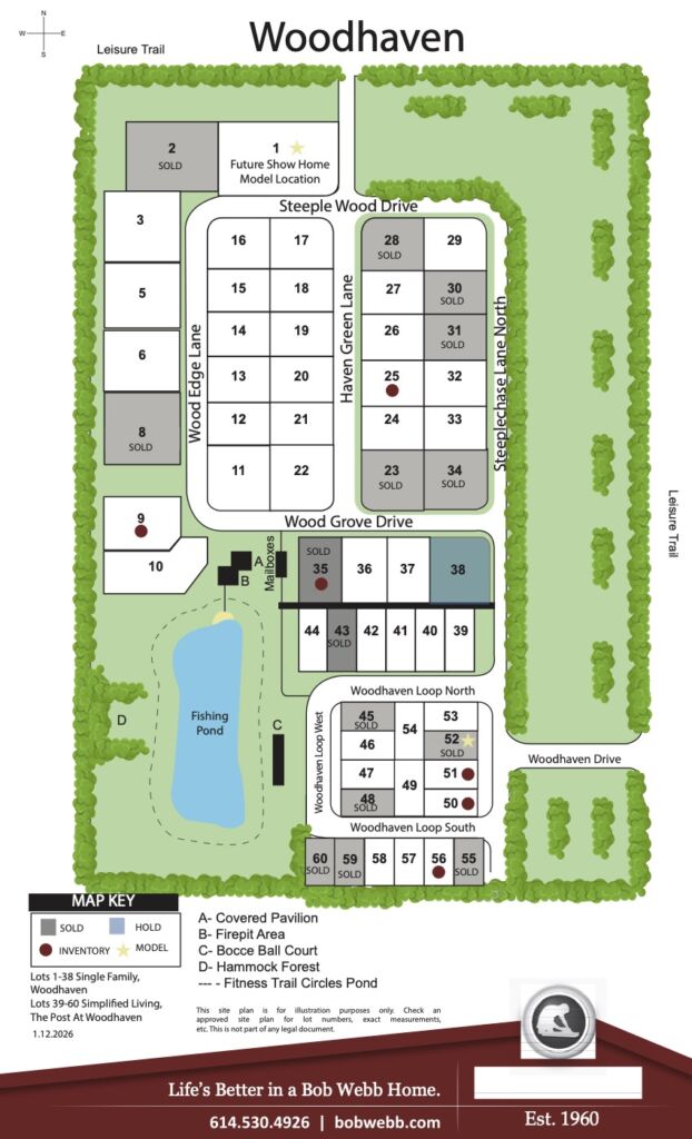A small, quiet community of custom-built Bob Webb homes is about to take shape in beautiful New Albany close to Bevelhymer Road and E. Walnut Street. We call it Woodhaven, and it’s been thoughtfully planned and designed to encourage different generations to live, play and spend time together. For example, in the center of the community residents will enjoy an outdoor fun-space with a covered picnic pavilion, outdoor patio with firepit, a bocci ball court… even a fishing pond! The perfect spot for neighborhood gatherings any season of the year!